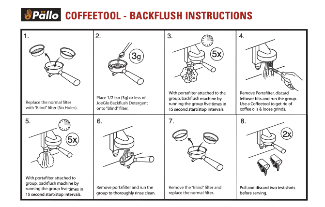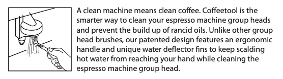 Coffeetool is the smarter way to clean your espresso machine group heads and prevent the build up of rancid oils. Unlike other group head brushes, the patented design features an ergonomic handle and unique water deflector fins to keep scalding hot water from reaching your hand while cleaning the espresso machine group head. The Steam Wand vent hole cleaner keeps vent holes clear of mineral deposits and milk residue, ensuring proper aeration of milk. The Detergent dosing spoon doses the appropriate amount of backflush detergent.