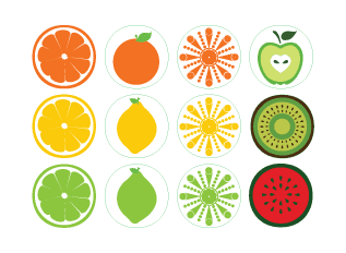 Mixed basket of fruit: oranges, lemons, limes, apples, kiwi and watermelon caps.