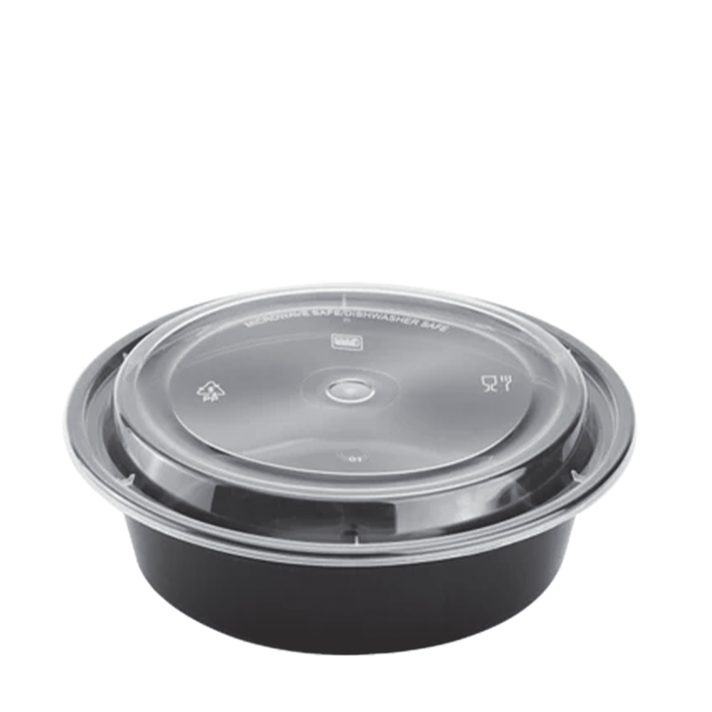 Karat round black, PP injection molded containers and lids are great for takeout and leftovers. Containers are microwavable and dishwasher safe.